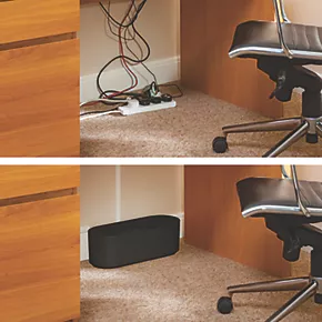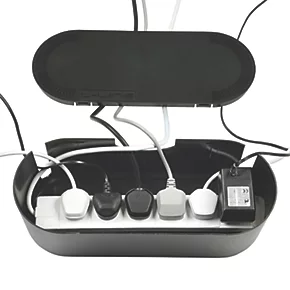 The smart and easy way to hide 6-way extension blocks and cable clutter. Eliminates trip hazards and minimises wasted floor and desk space. 3 rear cable entry/exit points.